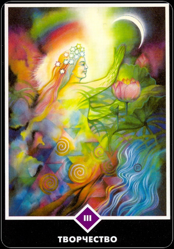 От алхимии огня и воды снизу к божественному свету, входящему сверху, фигура на этой карте буквально «одержима» творческой силой. Действительно, опыт творчества есть вход в таинственное. Методы, опыт и знания — только орудия. Главное — это использовать энергию, которая является горючим для рождения всего сущего.